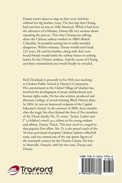 Danny wasn't about to step on that crazy rickshaw without his big brother, Gary. The last trip that Chiang had sent him on was to 1946 Montreal. While it had been the adventure of a lifetime, Danny felt very anxious about repeating the process. This time Chiang was talking about the Chinese railway workers in 1880's British Columbia. It sounded exciting but it really sounded dangerous. Within minutes, Danny would travel back 122 years. He and his brother, along with their new-found friends would battle the railway bosses in seeking justice for the Chinese workers. And the secret of Chiang and those mismatched eyes would finally be revealed.