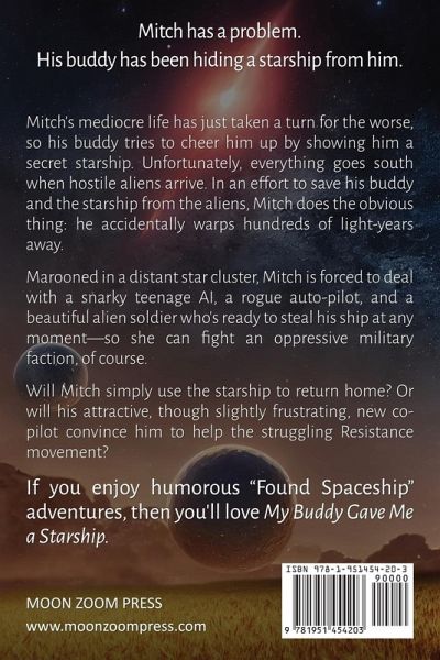 Mitch has a problem. His buddy has been hiding a starship from him. Mitch's mediocre life has just taken a turn for the worse, so his buddy tries to cheer him up by showing him a secret starship. Unfortunately, everything goes south when hostile aliens arrive. In an effort to save his buddy and the starship from the aliens, Mitch does the obvious thing: he accidentally warps hundreds of light-years away. Marooned in a distant star cluster, Mitch is forced to deal with a snarky teenage AI, a rogue auto-pilot, and a beautiful alien soldier who's ready to steal his ship at any moment-so she can fight an oppressive military faction, of course. Will Mitch simply use the starship to return home? Or will his attractive, though slightly frustrating, new co-pilot convince him to help the struggling Resistance movement? If you enjoy humorous "Found Spaceship" adventures, then you'll love My Buddy Gave Me a Starship.