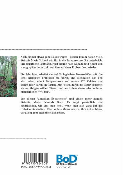 Noch einmal etwas ganz Neues wagen - diesen Traum haben viele. Stefanie Maria Schmid will ihn in die Tat umsetzen. Sie unterbricht ihre berufliche Laufbahn, reist alleine nach Kanada und findet sich wenig später beim Unkrautjäten auf einer Erdbeerfarm wieder. Ein Jahr lang arbeitet sie auf ökologischen Bauernhöfen mit. Sie lernt klapprige Traktoren zu fahren und Elchbullen das Fell abzuziehen, erlebt Temperaturen von minus 47 °Celsius und staunt über Bären im Garten. Auf Reisen durch die Natur begegnet sie unzähligen wilden Tier und auch dem einen oder anderen menschlichen "Wilden". Von diesen "Canadian Experiences" und vielen mehr handelt Stefanie Maria Schmids Buch. Es zeigt persönlich und eindrücklich, wie viel man lernt, wenn man sich ganz auf das Unbekannte einlässt. Über andere Menschen und ihre Art zu leben, vor allem aber auch über sich selbst.