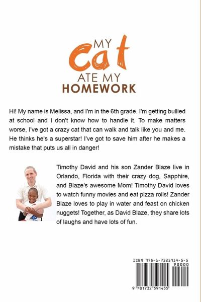 Age Level: 8 and up Grade Level: 3rd and up A talking cat is so much trouble! Hi! My name is Melissa, and I'm in the 6th grade. I'm getting bullied at school and I don't know how to handle it. To make matters worse, I've got a crazy cat that can walk and talk like you and me. He thinks he's a superstar! I've got to save him after he makes a mistake that puts us all in danger! My Cat Ate My Homework is a funny fantasy for kids, teachers, and parents -- an enjoyable story that pulls in even reluctant readers.