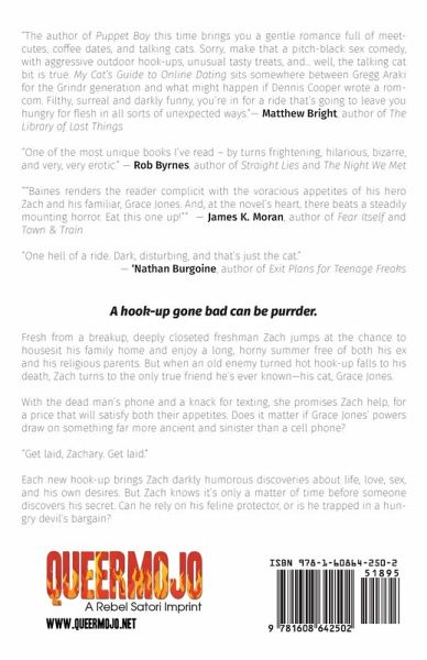 "The author of Puppet Boy this time brings you a gentle romance full of meet-cutes, coffee dates, and talking cats. Sorry, make that a pitch-black sex comedy, with aggressive outdoor hook-ups, unusual tasty treats, and... well, the talking cat bit is true. My Cat's Guide to Online Dating sits somewhere between Gregg Araki for the Grindr generation and what might happen if Dennis Cooper wrote a romcom. Filthy, surreal and darkly funny, you're in for a ride that's going to leave you hungry for flesh in all sorts of unexpected ways."- Matthew Bright, author of The Library of Lost Things "One of the most unique books I've read - by turns frightening, hilarious, bizarre, and very, very erotic." - Rob Byrnes, author of Straight Lies and The Night We Met ""Baines renders the reader complicit with the voracious appetites of his hero Zach and his familiar, Grace Jones. And, at the novel's heart, there beats a steadily mounting horror. Eat this one up!"" - James K. Moran, author of Fear Itself and Town & Train "One hell of a ride. Dark, disturbing, and that's just the cat."- 'Nathan Burgoine, author of Exit Plans for Teenage Freaks A hook-up gone bad can be purrder. Fresh from a breakup, deeply closeted freshman Zach jumps at the chance to housesit his family home and enjoy a long, horny summer free of both his ex and his religious parents. But when an old enemy turned hot hook-up falls to his death, Zach turns to the only true friend he's ever known-his cat, Grace Jones. With the dead man's phone and a knack for texting, she promises Zach help, for a price that will satisfy both their appetites. Does it matter if Grace Jones' powers draw on something far more ancient and sinister than a cell phone? "Get laid, Zachary. Get laid." Each new hook-up brings Zach darkly humorous discoveries about life, love, sex, and his own desires. But Zach knows it's only a matter of time before someone discovers his secret. Can he rely on his feline protector, or is he trapped in a hungry devil's bargain? Christian Baines is an awkward nerd turned slightly less awkward novelist. His work includes the paranormal series The Arcadia Trust, novella Skin, and Puppet Boy, a finalist for the 2016 Saints and Sinners Emerging Writer Award. Born in Australia, he now travels the world whenever possible, living, writing, and shivering in Toronto, Canada on the occasions he can't find his passport.