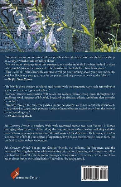 My Cemetery Friends is timeless. Walk with renowned author and poet Vincent J. Tomeo through garden pathways of life. Along the way, encounter other travelers, trekking a similar trail, embrace new acquaintances, and this will make all the difference. My Cemetery Friends is a celebration of life. It is six degrees of separation, how one can meet someone, and in turn, this can lead to other unique encounters. My Cemetery Friends honors our families, friends, our military, the forgotten, and the unnamed. We sing their praise while celebrating life, nature, humanity, and compassion, all in search of peace. Stroll with the author through a living museum over cemetery trails, and learn much about things overlooked before. You will not be disappointed. "Tomeo strikes me as not just a brilliant poet but also a daring thinker who boldly stands up on a subject which is seldom talked about." "My two main takeaways from this experience as a reader are to find the best method to share other people's joys and sorrows and to be thankful for the little life I have been given." "This is a book I wholeheartedly endorse; it will get you thinking about your own mortality, which will enhance your gratitude for the present and inspire you to live it to the fullest." -Pacific Book Review "He blends these thought-invoking meditations with the pragmatic ways such remembrance walks can affect one's personal sphere." "Tomeo's creative construction will touch his readers, enheartening them throughout by proffering vivid vignettes of life nobly lived and the timeless, etheric symbolism that pervades its ending." "Strolling through the cemetery yields a unique perspective, as Tomeo sensitively describes it. It is depicted as surprisingly pleasant, a place of natural beauty tucked away from the noise of the surrounding city." -US Review of Books