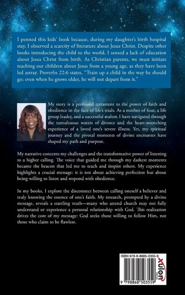 I penned this kids' book because, during my daughter's birth hospital stay, I observed a scarcity of literature about Jesus Christ. Despite other books introducing the child to the world, I sensed a lack of education about Jesus Christ from birth. As Christian parents, we must initiate teaching our children about Jesus from a young age, as they have been led astray. Proverbs 22:6 states, "Train up a child in the way he should go; even when he grows older, he will not depart from it." My story is a profound testament to the power of faith and obedience in the face of life's trials. As a mother of four, a life group leader, and a successful realtor, I have navigated through the tumultuous waters of divorce and the heart-wrenching experience of a loved one's severe illness. Yet, my spiritual journey and the pivotal moments of divine encounter have shaped my path and purpose. My narrative concerns my challenges and the transformative power of listening to a higher calling. The voice that guided me through my darkest moments became the beacon that led me to teach and inspire others. My experience highlights a crucial message: it is not about achieving perfection but about being willing to listen and respond with obedience. In my books, I explore the disconnect between calling oneself a believer and truly knowing the essence of one's faith. My research, prompted by a divine message, reveals a startling truth-many who attend church may not fully understand or experience a personal relationship with God. This realization drives the core of my message: God seeks those willing to follow Him, not those who claim to be flawless.