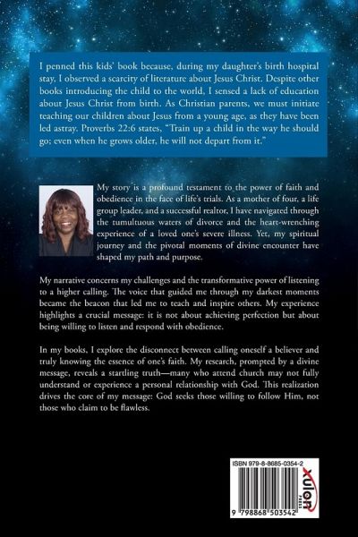 I penned this kids' book because, during my daughter's birth hospital stay, I observed a scarcity of literature about Jesus Christ. Despite other books introducing the child to the world, I sensed a lack of education about Jesus Christ from birth. As Christian parents, we must initiate teaching our children about Jesus from a young age, as they have been led astray. Proverbs 22:6 states, "Train up a child in the way he should go; even when he grows older, he will not depart from it." My story is a profound testament to the power of faith and obedience in the face of life's trials. As a mother of four, a life group leader, and a successful realtor, I have navigated through the tumultuous waters of divorce and the heart-wrenching experience of a loved one's severe illness. Yet, my spiritual journey and the pivotal moments of divine encounter have shaped my path and purpose. My narrative concerns my challenges and the transformative power of listening to a higher calling. The voice that guided me through my darkest moments became the beacon that led me to teach and inspire others. My experience highlights a crucial message: it is not about achieving perfection but about being willing to listen and respond with obedience. In my books, I explore the disconnect between calling oneself a believer and truly knowing the essence of one's faith. My research, prompted by a divine message, reveals a startling truth-many who attend church may not fully understand or experience a personal relationship with God. This realization drives the core of my message: God seeks those willing to follow Him, not those who claim to be flawless.