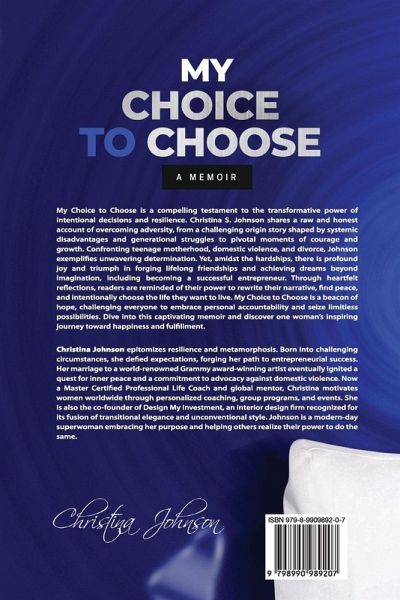 My Choice to Choose is a compelling testament to the transformative power of intentional decisions and resilience. Christina S. Johnson shares a raw and honest account of overcoming adversity, from a challenging origin story shaped by systemic disadvantages and generational struggles to pivotal moments of courage and growth. Confronting teenage motherhood, domestic violence, and divorce, Johnson exemplifies unwavering determination. Yet, amidst the hardships, there is profound joy and triumph in forging lifelong friendships and achieving dreams beyond imagination, including becoming a successful entrepreneur. Through heartfelt reflections, readers are reminded of their power to rewrite their narrative, find peace, and intentionally choose the life they want to live. My Choice to Choose is a beacon of hope, challenging everyone to embrace personal accountability and seize limitless possibilities. Dive into this captivating memoir and discover one woman's inspiring journey toward happiness and fulfillment. Christina Johnson epitomizes resilience and metamorphosis. Born into challenging circumstances, she defied expectations, forging her path to entrepreneurial success. Her marriage to a world-renowned Grammy award-winning artist eventually ignited a quest for inner peace and a commitment to advocacy against domestic violence. Now a Master Certified Professional Life Coach and global mentor, Christina motivates women worldwide through personalized coaching, group programs, and events. She is also the co-founder of Design My Investment, an interior design firm recognized for its fusion of transitional elegance and unconventional style. Johnson is a modern-day superwoman embracing her purpose and helping others realize their power to do the same.