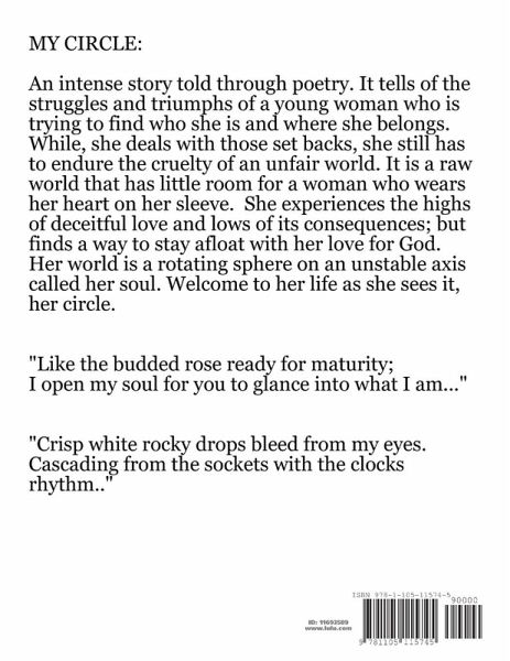 My Circle: An intense story told through poetry. It tells of the struggles and triumphs of a young woman who is trying to find who she is and where she belongs. While, she deals with those set backs, she still has to endure the cruelty of an unfair world. It is a raw world that has little room for a woman who wears her heart on her sleeve. She experiences the highs of deceitful love and lows of its consequences; but finds a way to stay afloat with her love for God. Her world is a rotating sphere on an unstable axis called her soul. Welcome to her life as she sees it, her circle. "I want to ascend into the heavens of understanding with you, where our only company are those of muses..."