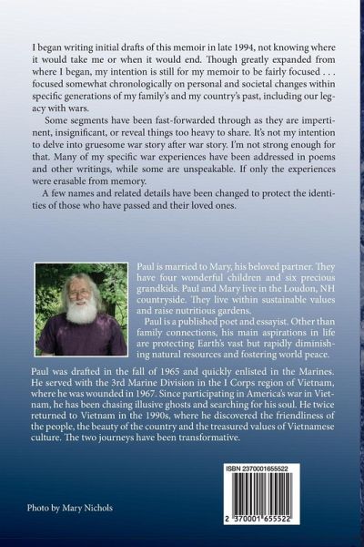 I began writing initial drafts of this memoir in late 1994, not knowing where it would take me or when it would end. Though greatly expanded from where I began, my intention is still for my memoir to be fairly focused . . . focused somewhat chronologically on personal and societal changes within specific generations of my family's and my country's past, including our legacy with wars. Some segments have been fast-forwarded through as they are impertinent, insignignicant, or reveal things too heavy to share. It's not my intention to delve into gruesome war story after war story. I'm not strong enough for that. Many of my specicific war experiences have been addressed in poems and other writings, while some are unspeakable. If only the experiences were erasable from memory. A few names and related details have been changed to protect the identities of those who have passed and their loved ones.
