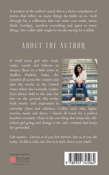 A window to the author's mind, this is a short compilation of poems that reflect on many things she holds on to. Swift through for a collection that can make you smile, weep, blush, nostalgic, question everything and agree to many things. Her coffee table might be worth staying for a while.