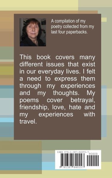 This book covers many different issues that exist in our everyday lives. I felt a need to express them through my experiences and my thoughts. My poems cover betrayal, friendship, love, hate and my experiences with travel. This book is a compilation of my last four paperbacks.