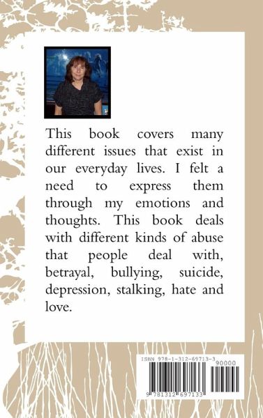 This book covers many different issues that exist in our everyday lives. I felt a need to express them through my emotions and thoughts. This book deals with different kinds of abuse that people deal with, betrayal, bullying, suicide, depression, stalking, hate and love.