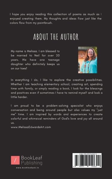 I hope you enjoy reading this collection of poems as much as I created them. My thoughts and ideas flow just like the colors flow my paintbrush.