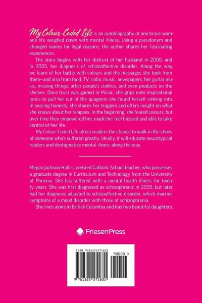 My Colour-Coded Life is an autobiography of one brave woman's life weighed down with mental illness. Using a pseudonym and changed names for legal reasons, the author shares her fascinating experiences. The story begins with her distrust of her husband in 2000, and in 2005, her diagnosis of schizoaffective disorder. Along the way, we learn of her battle with colours and the messages she took from them-and also from food, TV, radio, music, newspapers, her guitar music, missing things, other people's clothes, and even products on the shelves. Once trust was gained in Music, she grips onto inspirational lyrics to pull her out of the quagmire she found herself sinking into. In searing honesty, she shares her triggers and offers insight on what she knows about her relapses. In the beginning, she feared colours, but over time they empowered her, made her feel blessed and able to take control of her life. My Colour-Coded Life offers readers the chance to walk in the shoes of someone who's suffered greatly. Ideally, it will educate neurotypical readers and destigmatize mental illness along the way.