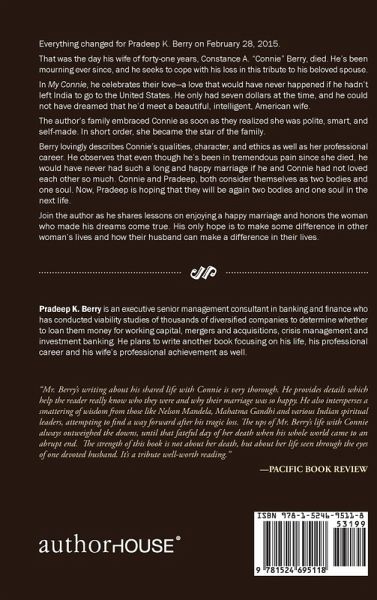Everything changed for Pradeep K. Berry on February 28, 2015. That was the day his wife of forty-one years, Constance A. "Connie" Berry, died. He's been mourning ever since, and he seeks to cope with his loss in this tribute to his beloved spouse. In My Connie, he celebrates their love-a love that would have never happened if he hadn't left India to go to the United States. He only had seven dollars at the time, and he could not have dreamed that he'd meet a beautiful, intelligent, American wife. The author's family embraced Connie as soon as they realized she was polite, smart, and self-made. In short order, she became the star of the family. Berry lovingly describes Connie's qualities, character, and ethics as well as her professional career. He observes that even though he's been in tremendous pain since she died, he would have never had such a long and happy marriage if he and Connie had not loved each other so much. Connie and Pradeep, both consider themselves as two bodies and one soul. Now, Pradeep is hoping that they will be again two bodies and one soul in the next life. Join the author as he shares lessons on enjoying a happy marriage and honors the woman who made his dreams come true. His only hope is to make some difference in other woman's lives and how their husband can make a difference in their lives.