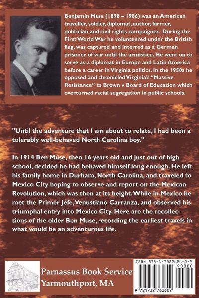 "Until the adventure that I am about to relate, I had been a tolerably well-behaved North Carolina boy." In 1914 Ben Muse, then 16 years old and just out of high school, decided he had behaved himself long enough. He left his family home in Durham, North Carolina, and traveled to Mexico City to observe and report on the Mexican Revolution, which was then at its height. While in Mexico he met the Primer Jefe, Venustiano Carranza, and observed his triumphal entry into Mexico City. Here are the recollections of the older Ben Muse, recording the earliest travels in what would be an adventurous life.