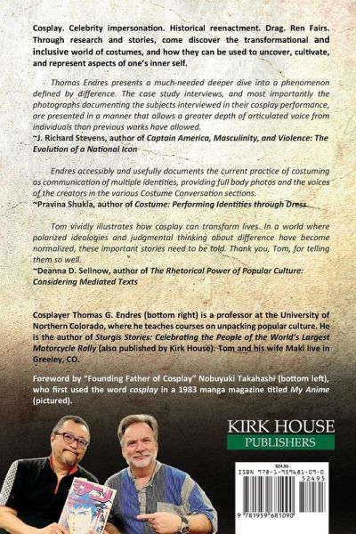 Cosplay. Celebrity impersonation. Historical reenactment. Drag. Ren Fairs. Through research and stories, come discover the transformational and inclusive world of costumes, and how they can be used to uncover, cultivate, and represent aspects of one's inner self. Thomas Endres presents a much-needed deeper dive into a phenomenon defined by difference. The case study interviews, and most importantly the photographs documenting the subjects interviewed in their cosplay performance, are presented in a manner that allows a greater depth of articulated voice from individuals than previous works have allowed. ~J. Richard Stevens, author of Captain America, Masculinity, and Violence: The Evolution of a National Icon Endres accessibly and usefully documents the current practice of costuming as communication of multiple identities, providing full body photos and the voices of the creators in the various Costume Conversation sections. ~Pravina Shukla, author of Costume: Performing Identities through Dress Tom vividly illustrates how cosplay can transform lives. In a world where polarized ideologies and judgmental thinking about difference have become normalized, these important stories need to be told. Thank you, Tom, for telling them so well. ~Deanna D. Sellnow, author of The Rhetorical Power of Popular Culture: Considering Mediated Texts Cosplayer Thomas G. Endres (bottom right) is a professor at the University of Northern Colorado, where he teaches courses on unpacking popular culture. He is the author of Sturgis Stories: Celebrating the People of the World's Largest Motorcycle Rally (also published by Kirk House). Tom and his wife Maki live in Greeley, CO.