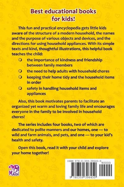 This fun and practical encyclopedia gets little kids aware of the structure of a modern household, the names and the purpose of various objects and devices, and the directions for using household appliances. With its simple texts and kind, thoughtful illustrations, this helpful book teaches the child: - the importance of kindness and friendship between family members - the need to help adults with household chores - keeping their home tidy and the household items in order - safety in handling household items and appliances Also, this book motivates parents to facilitate an organized yet warm and loving family life and encourages everyone in the family to be involved in household chores!