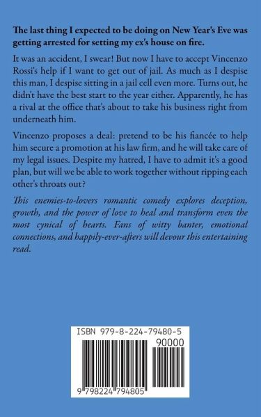 The last thing I expected to be doing on New Year's Eve was getting arrested for setting my ex's house on fire. It was an accident, I swear! But now I have to accept Vincenzo Rossi's help if I want to get out of jail. As much as I despise this man, I despise sitting in a jail cell even more. Turns out, he didn't have the best start to the year either. Apparently, he has a rival at the office that's about to take his business right from underneath him. Vincenzo proposes a deal: pretend to be his fiancée to help him secure a promotion at his law firm, and he will take care of my legal issues. Despite my hatred, I have to admit it's a good plan, but will we be able to work together without ripping each other's throats out? This enemies-to-lovers romantic comedy explores deception, growth, and the power of love to heal and transform even the most cynical of hearts. Fans of witty banter, emotional connections, and happily-ever-afters will devour this entertaining read.