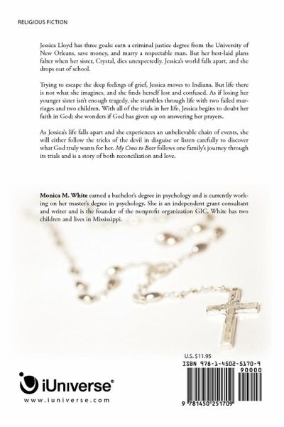 Jessica Lloyd has three goals: earn a criminal justice degree from the University of New Orleans, save money, and marry a respectable man. But her best-laid plans falter when her sister, Crystal, dies unexpectedly. Jessica's world falls apart, and she drops out of school. Trying to escape the deep feelings of grief, Jessica moves to Indiana. But life there is not what she imagines, and she finds herself lost and confused. As if losing her younger sister isn't enough tragedy, she stumbles through life with two failed marriages and two children. With all of the trials in her life, Jessica begins to doubt her faith in God; she wonders if God has given up on answering her prayers. As Jessica's life falls apart and she experiences an unbelievable chain of events, she will either follow the tricks of the devil in disguise or listen carefully to discover what God truly wants for her. My Cross to Bear follows one family's journey through its trials and is a story of both reconciliation and love.