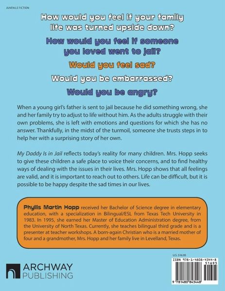 How would you feel if your family life was turned upside down? How would you feel if someone you loved went to jail? Would you feel sad? Would you be embarrassed? Would you be angry? When a young girl's father is sent to jail because he did something wrong, she and her family try to adjust to life without him. As the adults struggle with their own problems, she is left with emotions and questions for which she has no answer. Thankfully, in the midst of the turmoil, someone she trusts steps in to help her with a surprising story of her own. My Daddy Is in Jail reflects today's reality for many children. Mrs. Hopp seeks to give these children a safe place to voice their concerns, and to find healthy ways of dealing with the issues in their lives. Mrs. Hopp shows that all feelings are valid, and it is important to reach out to others. Life can be difficult, but it is possible to be happy despite the sad times in our lives.