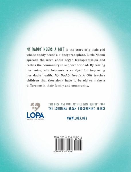 My Daddy Needs A Gift is the story of a little girl whose daddy needs a kidney transplant. Little Naomi spreads the word about organ transplantation and rallies the community to support her dad. By raising her voice, she becomes a catalyst for her improving her father's health. My Daddy Needs A Gift teaches children that they don't have to be old to make a difference in their family and community.
