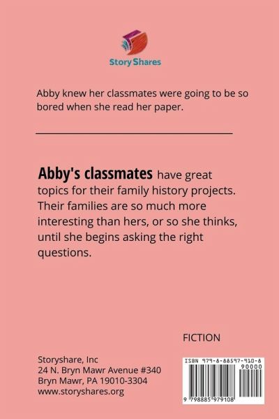 Abby is given an assignment to write an essay on her family history. As she listens to her classmates' stories, she feels disappointed that she has such a boring family history. However, once Abby starts asking questions, she realizes she does not have a boring family history after all.