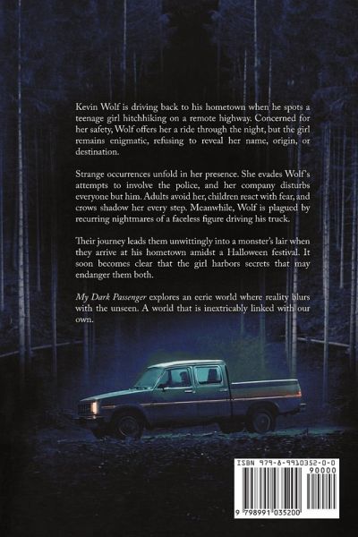 Kevin Wolf is driving back to his hometown when he spots a teenage girl hitchhiking on a remote highway. Concerned for her safety, Wolf offers her a ride through the night, but the girl remains enigmatic, refusing to reveal her name, origin, or destination. Strange occurrences unfold in her presence. She evades Wolf's attempts to involve the police, and her company disturbs everyone but him. Adults avoid her, children react with fear, and crows shadow her every step. Meanwhile, Wolf is plagued by recurring nightmares of a faceless figure driving his truck. Their journey leads them unwittingly into a monster's lair when they arrive at his hometown amidst a Halloween festival. It soon becomes clear that the girl harbors secrets that may endanger them both. My Dark Passenger explores an eerie world where reality blurs with the unseen. A world that is inextricably linked with our own.