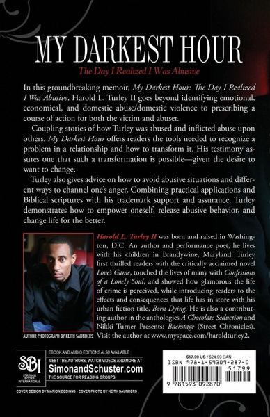 In this groundbreaking memoir, "My Darkest Hour: The Day I Realized I Was Abusive," Harold L. Turley II goes beyond identifying emotional, economical, and domestic abuse/domestic violence to prescribing a course of action for both the victim and abuser.Coupling stories of how Turley was abused and inflicted abuse upon others, "My Darkest Hour "offers readers the tools needed to recognize a problem in a relationship and how to transform it. His testimony assures one that such a transformation is possible--given the desire to want to change.Turley also gives advice on how to avoid abusive situations and different ways to channel one's anger. Combining practical applications and Biblical scriptures with his trademark support and assurance, Turley demonstrates how to empower oneself, release abusive behavior, and change life for the better.