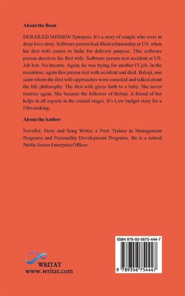 DERAILED MISSION Synopsis: It's a story of couple who were in deep love story. Software person had illicit relationship at US, when his first wife comes to India for delivery purpose. This software person deceives his first wife. Software person met accident at US. Job lost. No Income. Again, he was trying for another IT job. In the meantime, again this person met with accident and died. Babaji, one saint whom the first wife approaches were consoled and talked about the life philosophy. The first wife gives birth to a baby. She never marries again. She became the follower of Babaji. A friend of her helps in all aspects in the crucial stages. It's Low budget story for a Film making.