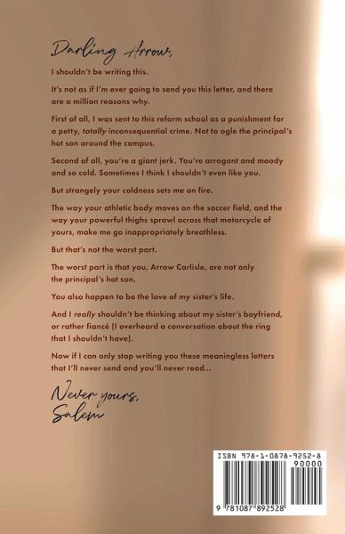 Darling Arrow, I shouldn't be writing this. It's not as if I'm ever going to send you this letter, and there are a million reasons why. First of all, I was sent to this reform school as a punishment for a petty, totally inconsequential crime. Not to ogle the principal's hot son around the campus. Second of all, you're a giant jerk. You're arrogant and moody and so cold. Sometimes I think I shouldn't even like you. But strangely your coldness sets me on fire. The way your athletic body moves on the soccer field, and the way your powerful thighs sprawl across that motorcycle of yours, make me go inappropriately breathless. But that's not the worst part. The worst part is that you, Arrow Carlisle, are not only the principal's hot son. You also happen to be the love of my sister's life. And I really shouldn't be thinking about my sister's boyfriend, or rather fiancé (I overheard a conversation about the ring that I shouldn't have). Now if I can only stop writing you these meaningless letters that I'll never send and you'll never read... Never yours, Salem NOTE: This is a STANDALONE novel set in the world of St. Mary's.