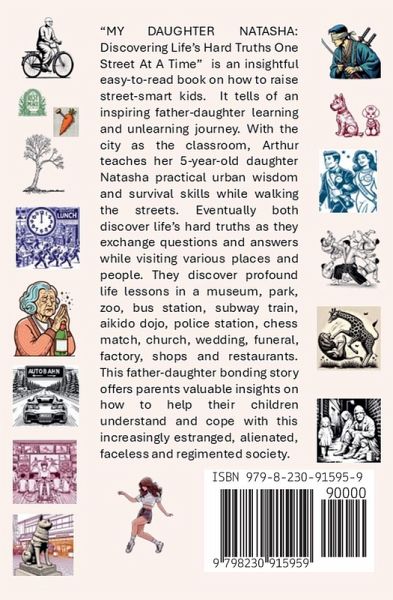 "MY DAUGHTER NATASHA: Discovering Life's Hard Truths One Street At A Time" is an insightful easy-to-read book on how to raise street-smart kids. It tells of an inspiring father-daughter learning and unlearning journey. With the city as the classroom, Arthur teaches her 5-year-old daughter Natasha practical urban wisdom and survival skills while walking the streets. Eventually both discover life's hard truths as they exchange questions and answers while visiting various places and people. They discover profound life lessons in a museum, park, zoo, bus station, subway train, aikido dojo, police station, chess match, church, wedding, funeral, factory, shops and restaurants. This father-daughter bonding story offers parents valuable insights on how to help their children understand and cope with this increasingly estranged, alienated, faceless and regimented society.