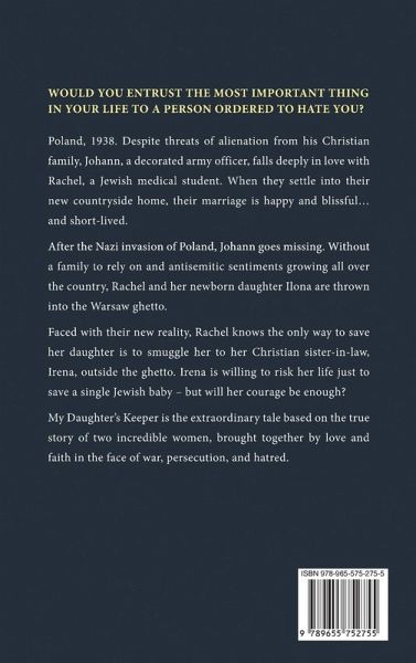 Would you entrust the most important thing in your life to a person ordered to hate you? Poland, 1938. Despite threats of alienation from his Christian family, Johann, a decorated army officer, falls deeply in love with Rachel, a Jewish medical student. When they settle into their new countryside home, their marriage is happy and blissful... and short-lived. After the Nazi invasion of Poland, Johann goes missing. Without a family to rely on and antisemitic sentiments growing all over the country, Rachel and her newborn daughter Ilona are thrown into the Warsaw ghetto. Faced with their new reality, Rachel knows the only way to save her daughter is to smuggle her to her Christian sister-in-law, Irena, outside the ghetto. Irena is willing to risk her life just to save a single Jewish baby - but will her courage be enough? My Daughter's Keeper is the extraordinary tale based on the true story of two incredible women, brought together by love and faith in the face of war, persecution, and hatred.