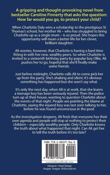 A gripping and thought-provoking novel from bestseller Caroline Finnerty that asks the question: How far would you go, to protect your child? When Charlotte Daly wins a scholarship to the prestigious St Thomas's school, her mother Ali - who has struggled to bring Charlotte up as a single mum - is so proud. She hopes this opportunity will mean a better life for her clever, brilliant daughter. Ali worries, however, that Charlotte is having a hard time fitting in with her new, wealthy peers. So when Charlotte is invited to a sixteenth birthday party by popular boy Ollie, Ali pushes her to go, hopeful that she'll finally make some friends. Just before midnight, Charlotte calls Ali to come pick her up from the party. She's shaking and silent: it's obvious something has happened but she won't say what. It's only the next day, when Ali is at work, that she learns a teenage boy has been seriously injured. Then the police turn up at their house, wanting to question Charlotte about the events of that night. People are pointing the blame at Charlotte, saying the injured boy was last seen talking to her, before he was found unconscious in the pool. As the investigation deepens, Ali finds that everyone has their own agenda and people will stop at nothing to protect their children - especially wealthy people. Only Charlotte knows the truth about what happened that night. Can Ali get her to tell the truth before it's too late? Praise for Caroline Finnerty: 'A book that will break your heart and then piece it slowly back together.' Sinead Moriarty 'Touching and poignant, this book took me on an emotional ride. A gripping and absorbing read.' Leah Mercer