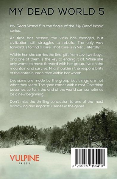 My Dead World 5 is the finale of the My Dead World series. As time has passed, the virus has changed, but civilization still struggles to rebuild. The only way forward is to find a cure. That cure is in Nila ... literally. Within her, she carries the final gift from Lev: twin boys, and one of them is the key to ending it all. While she only wants to move forward with her group, live on the mountain and survive, Nila shoulders the responsibility of the entire human race within her womb. Decisions are made by the group but things are not what they seem. The good comes with a cost. One thing becomes certain, the end of the world can sometimes be a new beginning. Don't miss the thrilling conclusion to one of the most harrowing and impactful series in the genre.
