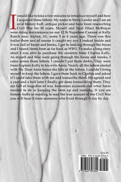 I would like to take a few minutes to introduce myself and how I acquired these letters. My name is Steve Lawler and I am an avid history buff, antique picker and have been researching Civil War for 30 years. Myself and Neal (Mac) McBrayer were doing maintenance on our 12 lb Napoleon Cannon at Kelly Ranch near Alpine, AL. some 5 or 6 years ago. There was this trailer there and of course it caught my eye. I looked inside and it was full of boxes and books. I got to looking through the boxes and I found items from as far back as WW1. To make a long story short I was able to purchase the contents from Charles Kelly. As myself and Mac were going through the boxes and trunks, I came across these letters. I couldn't put them down. They were from Captain Kelly to his wife Amie. Nearly all the letters started with My Dear Amie hence the title of the letters. I couldn't bring myself to keep the letters. I gave them back to Charles and asked if I could take them with me and transcribe them. He agreed and a year and a half later I finally got done transcribing them. They are full of tragedies of war, humorous accounts and what Amie needed to do in keeping the farm up and running. If you are history buffs or needing to read the true account of the Civil War you will hear it from someone who lived through it day by day.