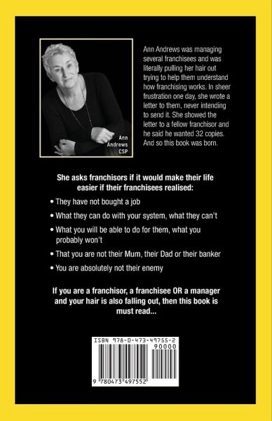 Ann Andrews was managing several franchisees and was literally pulling her hair out trying to help them understand how franchising works. In sheer frustration one day, she wrote a letter to them, never intending to send it. She showed the letter to a fellow franchisor and he said he wanted 32 copies. And so this book was born. She asks franchisors if it would make their life easier if their franchisees realised: They have not bought a job What they can do with your system, what they can’t What you will be able to do for them, what you probably won’t That you are not their mum, their dad or their banker You are absolutely not their enemy If you are a franchisor, a franchisee OR a manager and your hair is also falling out, then this book is must read...