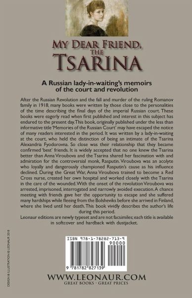 A Russian lady-in-waiting’s memoirs of the court and revolution After the Russian Revolution and the fall and murder of the ruling Romanov family in 1918, many books were written by those close to the personalities of the time describing the final days of the imperial Russian court. These books were eagerly read when first published and interest in this subject has endured to the present day. This book, originally published under the less than informative title ‘Memories of the Russian Court’ may have escaped the notice of many readers interested in the period. It was written by a lady-in-waiting at the court, who held the distinction of being an intimate of the Tsarina Alexandria Fyodorovna. So close was their relationship that they became confirmed ‘best’ friends. It is widely accepted that no one knew the Tsarina better than Anna Viroubova and the Tsarina shared her fascination with and admiration for the controversial monk, Rasputin. Viroubova was an acolyte who loyally and dangerously championed Rasputin’s cause as his influence declined. During the Great War, Anna Viroubova trained to become a Red Cross nurse, created her own hospital and worked closely with the Tsarina in the care of the wounded. With the onset of the revolution Viroubova was arrested, imprisoned, interrogated and narrowly avoided execution. A chance meeting with friends gave her the opportunity to escape and she suffered many hardships while fleeing from the Bolsheviks before she arrived in Finland, where she lived until her death. This book vividly describes the author’s life during this period. Leonaur editions are newly typeset and are not facsimiles; each title is available in softcover and hardback with dustjacket.