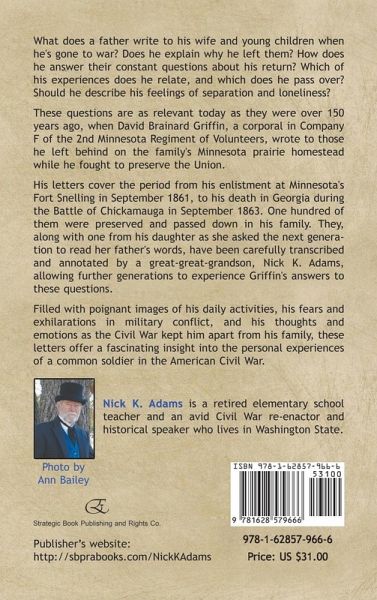 What does a father write to his wife and young children when he's gone to war? Does he explain why he left them? How does he answer their constant questions about his return? Which of his experiences does he relate, and which does he pass over? Should he describe his feelings of separation and loneliness? These questions are as relevant today as they were over 150 years ago, when David Brainard Griffin, a corporal in Company F of the 2nd Minnesota Regiment of Volunteers, wrote to those he left behind on the family's Minnesota prairie homestead while he fought to preserve the Union. His letters cover the period from his enlistment at Minnesota's Fort Snelling in September 1861, to his death in Georgia during the Battle of Chickamauga in September 1863. One hundred of them were preserved and passed down in his family. They, along with one from his daughter as she asked the next generation to read her father's words, have been carefully transcribed and annotated by a great-great-grandson, Nick K. Adams, allowing further generations to experience Griffin's answers to these questions. Filled with poignant images of his daily activities, his fears and exhilarations in military conflict, and his thoughts and emotions as the Civil War kept him apart from his family, these letters offer a fascinating insight into the personal experiences of a common soldier in the American Civil War. Nick K. Adams is a retired elementary school teacher and an avid Civil War re-enactor and historical speaker who lives in Washington State.