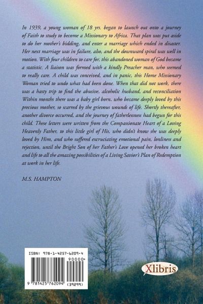 In 1939, a young woman of 18 yrs. began to launch out onto a journey of Faith to study to become a Missionary to Africa. That plan was put aside to do her mother's bidding, and enter a marriage which ended in disaster. Her next marriage was in failure, also, and the downward spiral was well in motion. With four children to care for, this abandoned woman of God became a statistic. A liaison was formed with a kindly Preacher man, who seemed to really care. A child was conceived, and in panic, this Home Missionary Woman tried to undo what had been done. When that did not work, there was a hasty trip to fi nd the abusive, alcoholic husband, and reconciliation Within months there was a baby girl born, who became deeply loved by this precious mother, so scarred by the grievous wounds of life. Shortly thereafter, another divorce occurred, and the journey of fatherlessness had begun for this child. These letters were written from the Compassionate Heart of a Loving Heavenly Father, to this little girl of His, who didn't know she was deeply loved by Him, and who suffered excruciating emotional pain, lonliness and rejection, until the Bright Son of her Father's Love opened her broken heart and life to all the amazing possibilities of a Living Savior's Plan of Redemption at work in her life. M.S. HAMPTON