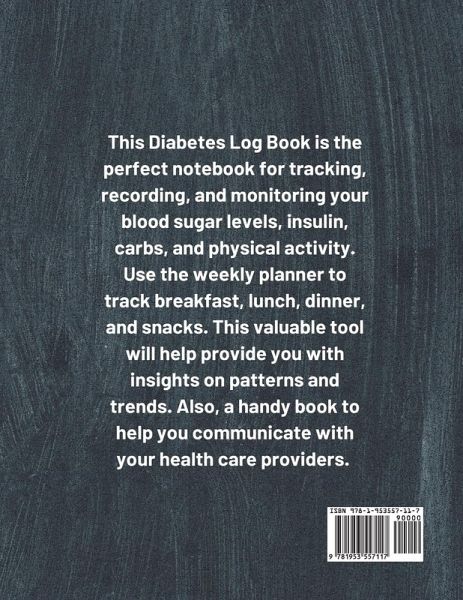 This Diabetes Log Book is the perfect notebook for tracking, recording, and monitoring your blood sugar levels, insulin doses, carbs, and physical activity. Use the weekly/daily planner to track breakfast, lunch, dinner, and snacks. This valuable tool will help provide you with insights on patterns and trends. When you write down the numbers it will be easier to see blood sugar patterns and know when you are on target. This handy book will help you communicate the data with your health care providers. Features:Weekly Log for mealtime readings: for Monday through Sunday: breakfast, lunch, dinner, two snacks, and bedtime Record pre and post readings for each meal Record- blood sugar, insulin dose, grams of carbs, physical activity Weekly space for notes Details:Pages- 124 Size- 8.5" x 11" Paperback Matte finish Order this book today to start logging your blood sugar levels. Makes a thoughtful gift for family and friends.