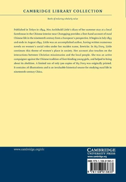 Published in Tokyo in 1894, Mrs Little's diary of her summer stay at a local farmhouse in the Chinese interior near Chongqing provides a first-hand account of rural Chinese life in the nineteenth century from a European's perspective. Mrs Little was an accomplished author, having written numerous novels on women's social roles under her maiden name, Bewicke. In My Diary, she continues this theme of women's place in society. Her account also touches on the interactions between Christian missionaries and the local people. She was an active campaigner against the Chinese tradition of binding the feet of young girls, and helped to bring about its abolition. A limited run of only 500 copies of My Diary was originally printed. It contains 26 illustrations and is an invaluable historical source for studying rural life in nineteenth-century China.