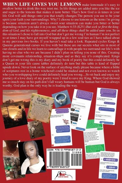 When Life Gives You Lemons Make Lemonade It's Easy To Swallow Better To Drink This Way Trust Me. In Life, Things Are Added Unto You Like The Ice And Sugar To The Lemons That Makes It Taste Better. That's How God Is In Times In Your Life God Will Add Things Onto You That Totally Changes. The Person You Use To Be Your Spirit Your Faith Your Surroundings. Why? I Choose To Use Lemons As The Term I'm Giving Is Because Situation Aren't Always Sweet Sour Situation Can Make You Bitter Or Better Depending On How You Take It In You See. Matthew 6:33 (KJV) But Seek Ye First The Kingdom of God, And His Righteousness, And All These Things Shall Be Added Unto You. So In This Situation, I Chose To Fall Into God But Don't Get Me Wrong I'm Human I'm Not Perfect So At Times I May Have Got Myself Wrapped Up In A Few Soul ties As I Have Talked About In My Previous Two Books If You Haven't Read Take A Look. Repeated Cycles Kings & Queens Generational Curses We Live With But These Are Our Secrets What Sits In Most Of Our Closets And In Life We Learn To Camouflage It With People We Surround Our Life's With Having No Clue Who We Are Because I Didn't Plan On Telling You None Of This. Creating More Covenants Relationship, Situation ships, And As They Say It's Complicated. Kings Don't Get Me Wrong This is My Diary And My Book Of Poetry But This Could Definitely Be A Queen In Your Life Cause Tables Definitely Do Turn But This Table is Kind Of Flipped Upside Down. Never Look on the Surface Of Anything Study Please Because Where A Bible Of Scriptures Rest In A Home Witchcraft Could Be Studied And Not Even Known So Watch Who You Worshipping Love Could Definitely Lead You Wrong...So Sit Back And In Enjoy My Journey Of A Love Diary Of My Poetry Were I Tried To Save My King. Where God Showed Me So Much Stay On His Path Don't Fall Weary Humans Will Be Human But God Is Always Worthy. God Plan Is The Only Way He Is Leading The Way.