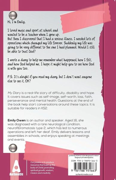 Facing deafness as a teenager, this is the remarkable true story of Emily Owen told in a diary format for older children. Hi, I'm Emily. I loved music and sport at school and wanted to be a teacher when I grew up. But then I discovered that I had a serious illness. I needed lots of operations which changed my life forever. Suddenly my life was going to be very different to the one I had planned. Would I still be able to trust God? I wrote a diary to help me remember what happened, how I felt, and how God helped me. I hope it might help you to see how God is with you too. P.S. It's alright if you read my diary, but I don't want anyone else to see it, OK? Content Benefits: Written as diary entries, children can see first-hand how Emily learnt to trust God in all her circumstances and learn that even though life might not work out as expected, God always has a plan. A real-life story of difficulty, disability and hope Covers issues such as self-image, self-worth, loss, faith, perseverance and mental health Questions at the end of the book help start conversations around these topics Looks at how a teenager dealt with becoming deaf and faced serious health issues Told in a first person, diary format Includes line drawings Shows that God is with us even in the worst of circumstances Encourages readers to be thankful everyday Ideal for Sunday School prizes or gifts Suitable for schools to use in RE or PHSE Suitable for children aged 8-12