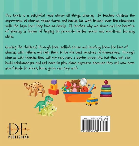The book is a delightful read about all things sharing. It teaches children the importance of sharing, taking turns, and having fun with friends over the obsession with the items that they love so dearly, why we share, and the benefits of sharing, in hopes of helping to promote social and emotional learning skills. By guiding the child(ren) through their selfish phase of learning to share, will help them be the best version of themselves. Through sharing with friends, they will have a better social life; they will build relationships; and emotionally, they will not have to play alone anymore…mehr
