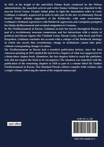 In 1919, at the height of the anti-leftist Palmer Raids conducted by the Wilson administration, the anarchist activist and writer Emma Goldman was deported to the nascent Soviet Union. Despite initial plans to fight the deportation order in court, Goldman eventually acquiesced in order to take part in the new revolutionary Russia herself. While initially supportive of the Bolsheviks, with some reservations, Goldman¿s firsthand experiences with Bolshevik oppression and corruption prompted her titular disillusionment and eventual emigration to Germany. In My Disillusionment in Russia, Goldman records her travels throughout Russia as part of a revolutionary museum commission, and her interactions with a variety of political and literary figures like Vladimir Lenin, Maxim Gorky, John Reed, and Peter Kropotkin. Goldman concludes her account with a critique of the Bolshevik ideology in which she asserts that revolutionary change in institutions cannot take place without corresponding changes in values. My Disillusionment in Russia had a troubled publication history, since the first American printing in 1923 omitted the last twelve chapters of what was supposed to be a thirty-three chapter book. (Somehow, the last chapters failed to reach the publisher, who did not suspect the book to be incomplete.) The situation was remedied with the publication of the remaining chapters in 1924 as part of a volume titled My Further Disillusionment in Russia. This Standard Ebooks edition compiles both volumes into a single volume, following the intent of the original manuscript.