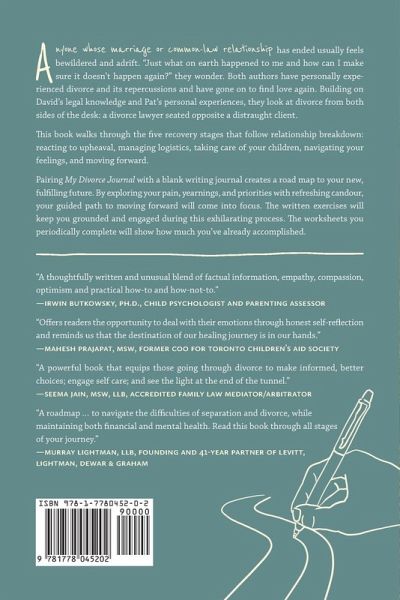 "A top-of-list guidebook for separating and divorcing parents." -Barbara Fidler, Ph.D., Clinical Developmental Psychologist Anyone whose marriage or common-law relationship has ended usually feels bewildered and adrift. "Just what on earth happened to me and how can I make sure it doesn't happen again?" they wonder. Both authors have personally experienced divorce and its repercussions and have gone on to find love again. Building on David's legal knowledge and Pat's personal experiences, they look at divorce from both sides of the desk: a divorce lawyer seated opposite a distraught client. This book walks through the five recovery stages that follow relationship breakdown: reacting to upheaval, managing logistics, taking care of your children, navigating your feelings, and moving forward. Pairing My Divorce Journal with a blank writing journal creates a road map to your new, fulfilling future. By exploring your pain, yearnings, and priorities with refreshing candour, your guided path to moving forward will come into focus. The written exercises will keep you grounded and engaged during this exhilarating process. The worksheets you periodically complete will show how much you've already accomplished.