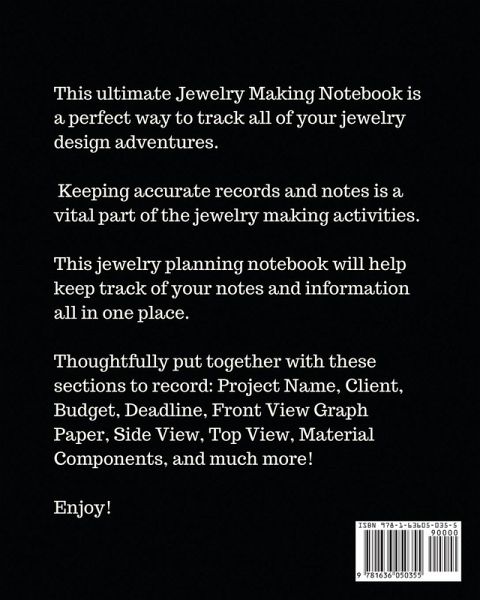 How to use this Jewelry Making Notebook: 8 X 10 Inches 110 Pages This useful jewelry project log book is a must-have for anyone that loves the art of designing jewelry! You will love this easy to use journal to track and record all your architecture activities. Each interior page includes space to record & track the following: Project Name - Write down the name of the current project. Date - Use this space to fill in the date of the project. Clients - Record and Track the client's name. Budget - Fill in the allowed budget for this project. Deadline - Write out the deadline for the project. Dimensions - Stay on task using the grid graph to sketch out the front, side and top view of the piece of jewelry. Material Components - Write out the details of each material, weight, quantity and the price. If you are new to the world of making jewelry or have been at it for a while, this jewelry making planner is a must have! Can make a great useful gift for anyone that loves to make jewelry! Have Fun!