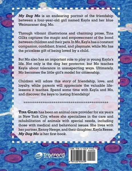 My Dog Mo is an endearing portrait of the friendship between a four-year-old girl named Kayla and her blue Weimaraner dog, Mo. Through vibrant illustrations and charming prose, Tina Gilks captures the magic and empowerment of the bond between children and their pets. In Mo, Kayla has a constant companion, confidant, friend, and playmate, while Mo has the priceless gift of being loved by a child. But Mo also has an important role to play in young Kayla's life. Not only is the dog her protector, but Mo teaches Kayla about tolerance in unsuspecting ways. Ultimately, Mo becomes the little girl's model for citizenship. Children will adore this story of friendship, love, and loyalty, while parents will appreciate the valuable life-lessons it teaches. Spend some time with Kayla and Mo, and discover the keys to lasting friendship!