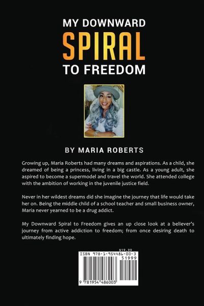 My Downward Spiral to Freedom gives an up close look at a believer's journey from active drug addiction to freedom. From once desiring death to ultimately finding hope. Growing up, Maria Roberts had many dreams and aspirations. As a child, she dreamed of being a princess, living in a big castle. As a young adult, she aspired to become a supermodel and travel the world. She attended college with the ambition of working in the juvenile justice field. Never in her wildest dreams did she imagine the journey that life would take her on. Being the middle child of a school teacher and small business owner, Maria never yearned to be a drug addict.
