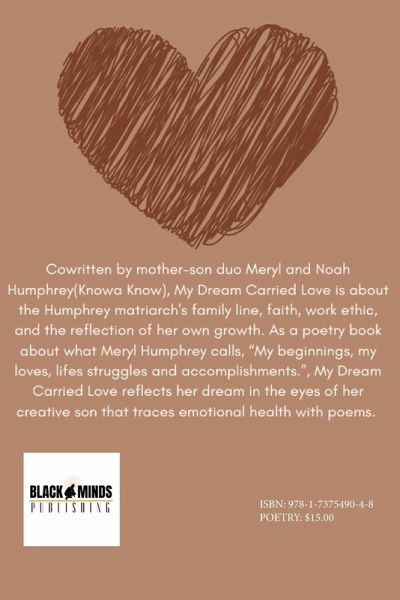 Cowritten by mother-son duo Meryl and Noah Humphrey(Knowa Know), My Dream Carried Love is about the Humphrey matriarch's family line, faith, work ethic, and the reflection of her own growth. As a poetry book about what Meryl Humphrey calls, "My beginnings, my loves, life's struggles and accomplishments.", My Dream Carried Love reflects her dream in the eyes of her creative son that traces emotional health with poems.