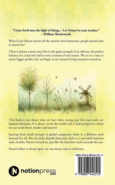 "Come forth into the light of things, / Let Nature be your teacher." - William Wordsworth What if our Nature knows all the answers that businesses, people spend years in search for? There is always a sweet story lies in the quiet strength of an old tree, the perfect balance of a coral reef and in every creation of our nature. We are in a race to create bigger profits, but we forget to see nature's living treasures around us. This book is not about what we have done wrong past the years with our business decisions. It is about, to see the world with a fresh perspective where we can work better, kinder and smarter. Starting from small startups to global companies, there is a different path forward for all. But all paths should ultimately lead to a successful business and a healthy Nature around us, just like the branches reach towards the sun. Nature's door is always open, we can always step in and learn.